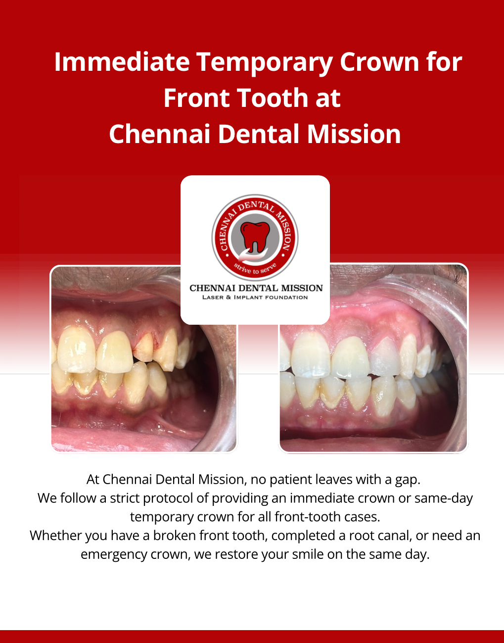 At Chennai Dental Mission, no patient leaves with a gap. We follow a strict protocol of providing an immediate crown or same-day temporary crown for all front-tooth cases. Whether you have a broken front tooth, completed a root canal, or need an emergency crown, we restore your smile on the same day. Looking for a dentist near me, same-day dental crown Chennai, front tooth crown Anna Nagar, or emergency dentist Chennai? Visit Chennai Dental Mission for fast, aesthetic and natural-looking front-tooth crowns. Book Appointment Today Your smile stays complete — from Day 1.