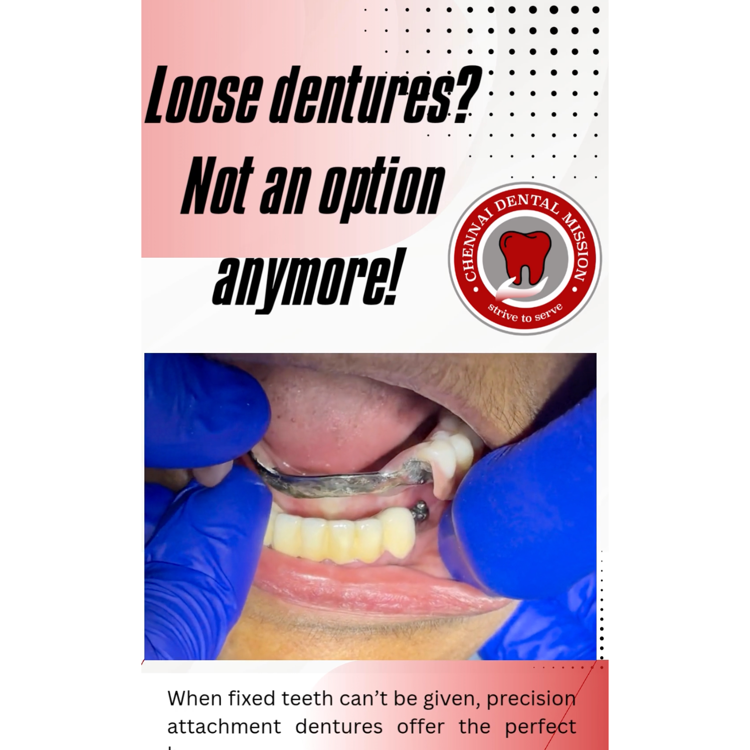 When a fixed dental option isn’t possible — due to insufficient bone support, medical limitations, or missing abutment teeth — you don’t have to settle for loose, uncomfortable removable dentures. At Chennai Dental Mission, Anna Nagar, we offer an advanced alternative: Precision Attachment Dentures This modern prosthodontic solution bridges the gap between fixed and removable teeth, offering the comfort and grip of fixed restorations with the flexibility and convenience of removable dentures. Why Choose Precision Attachments? Perfect for cases where fixed bridges or implants aren’t possible Inadequate bone height or density for implants Missing multiple teeth in different areas Financial or medical limitations preventing surgical options Desire for a less invasive yet stable replacement Better than conventional removable dentures No loose, shaky feeling while eating or talking Hidden attachment system (no visible metal clasps) Excellent fit and comfort — no gum irritation or sore spots Natural, aesthetic look that blends with your real teeth Easy to maintain and remove for cleaning Experience Precision, Comfort & Confidence At Chennai Dental Mission, our expert team led by Dr. Praveen Perumal uses advanced techniques to design custom precision attachment dentures that ensure long-term stability and beautiful smiles. Each case is carefully planned using digital imaging and precision milling to ensure: Perfect fit and bite alignment Long-term durability A confident, natural smile Visit Us Today If you’re struggling with loose dentures or have been told that implants or fixed teeth aren’t possible, visit Chennai Dental Mission, Anna Nagar. We’ll help you discover the comfort and confidence of precision attachment dentistry — a truly life-changing solution.